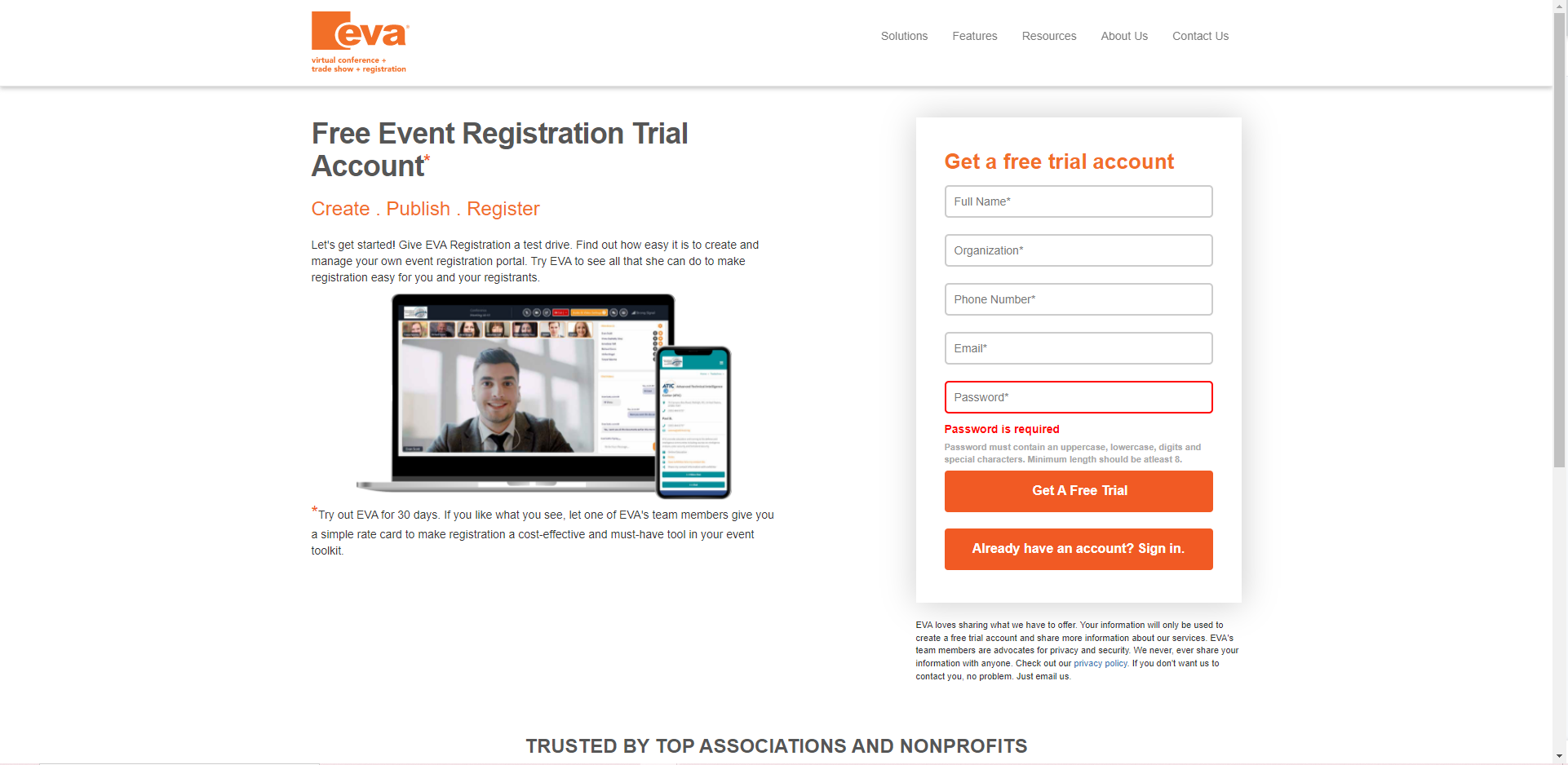 1. Go to evareg.com 2. Scroll down and click the "30-Day Free Trial" button 3. Type in your name, organization, phone number, email, and create a password Your password must contain the following: 1 Uppercase letter 1 Lowercase letter 1 number ...